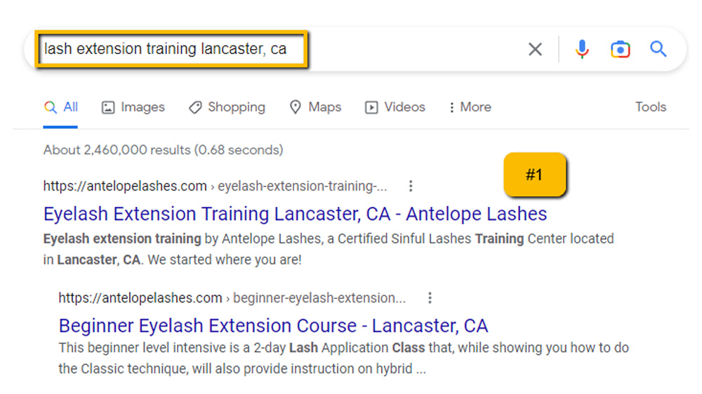 Our client, a lash extension artist based in a competitive area of Southern California, was opening up their lash extension salon and needed to create an online presence and start ranking on search engines as quickly as possible.